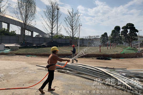 因该建筑工地位于中心城区,扬尘问题尤为重要。项目部在施工现场采取围墙、雾炮、喷淋系统等措施,将700米的全封闭围墙上部安装300多个喷淋头,重点施工部位设有专人定点洒水冲洗,新增实时监测PM10、PM2.5、噪声、温湿度、风速等数值,一旦数值超标,喷淋系统自动开启,洒水降尘。