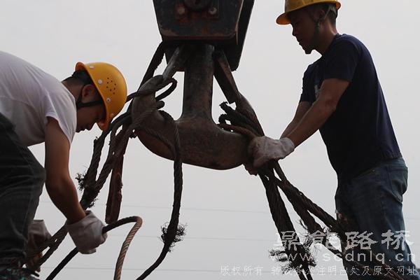 15日施工现场,专监、安全、施工、吊装等30余名项目管理人员及作业人员进行着最后的调试检测工作。中午13时许,随着最大起吊重量220吨的4台大型吊车和运输T梁的2台炮车发出的阵阵轰鸣声,吊装作业正式启动。此时梁场内两台起吊设备在司索的同步指挥下将梁片徐徐吊离台座,随后由2辆炮车将T梁运输到固定导梁,通过导梁逐一安装到一号和二号桥墩之间。经过项目团队连续两日的不懈奋战,顺利于次日完成了何家嘴大桥二跨T梁的吊装工作。