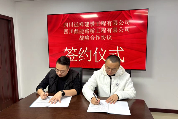 近日,鼎能路桥与四川远祥建设工程有限公司在公司机关会议室举行战略合作协议签订仪式。鼎能路桥副总经理(主持经理层工作)吴彬霞主持会议,公司党总支书记、董事长李涛,四川远祥建设负责人张腾出席签约仪式。