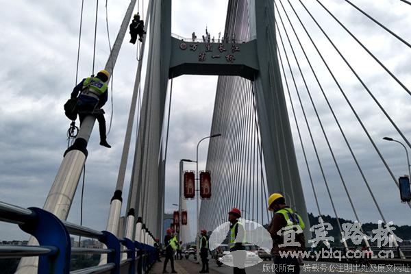 10月10日上午,宜宾路桥承建的长江桥亮化工程项目工地上,四组“蜘蛛”人正悬挂在桥梁斜拉索上开展高空作业,紧张有序地铺设亮化工程的灯具电缆,为灯具的安装做好充分准备。