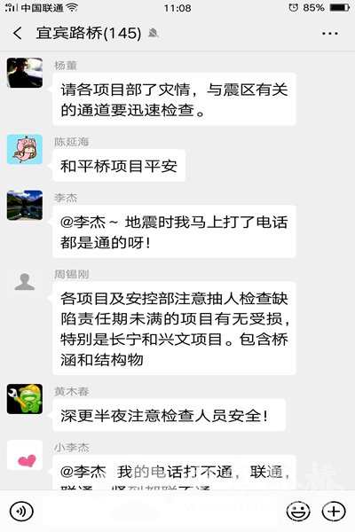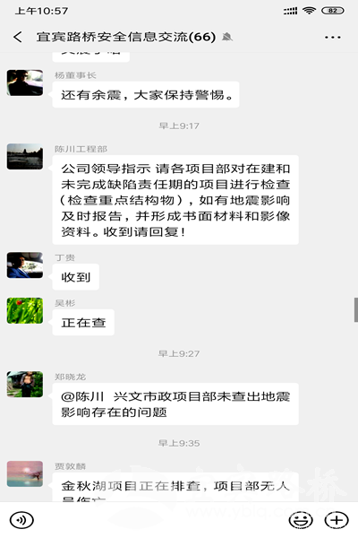 6月17日晚22.55分,宜宾长宁县发生6.0级地震,地震发生的4分钟后,宜宾路桥董事长杨祖强在电话无法打通的情况下,在公司微信群里发出通知:请各项目部迅速了解灾情,迅速检查与震区有关的通道。随即,公司应急救援指挥部领导小组成员同步在群内发出了各项目部立即启动安全生产应急救援预案,在确保人员安全的情况下,做好安全防范,迅速检查所在项目的人员设备和结构物有无受到地震影响的通知。