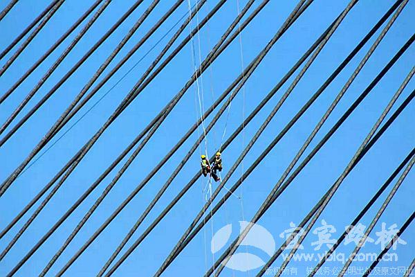 2017年底,宜宾路桥成功投资的长江桥亮化工程项目在紧锣密鼓的筹备下开工了。工程分为两个部分,一部分是对桥体进行涂装,二部分是在桥身的288根拉索上安装20万个点光源。长江桥全长928.73米,主桥悬挂于长江通航水位上58米处,北桥塔高172米,南桥塔高159米,整个施工高度相当五六十层楼的高度,这意味着施工的整个过程基本将在高空中进行,这对于从未实施过户外高空作业的宜宾路桥来说是一个全新的挑战。