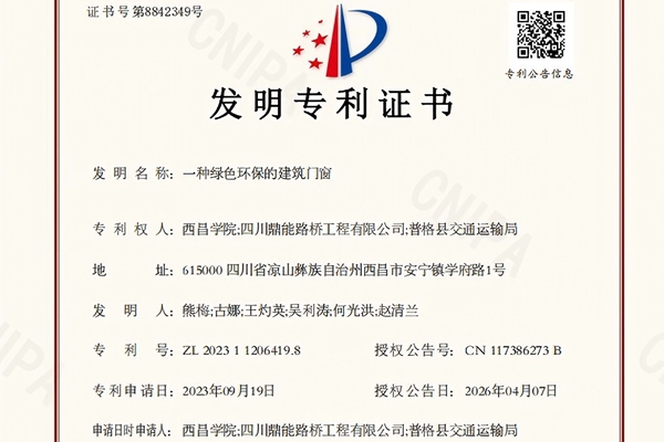 国家知识产权局依照《中华人民共和国专利法》相关规定,经过严格审查,正式授予鼎能路桥联合西昌学院、普格县交通运输局共同申报的“一种绿色环保的建筑门窗”专利权。