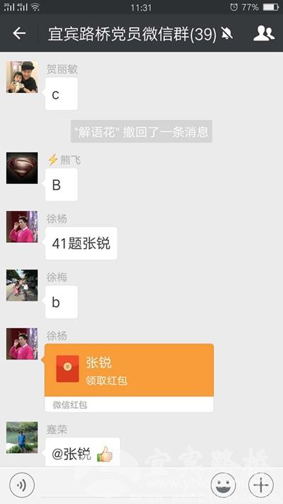 此次比赛题目均是平时大家在微信平台上所学习的党建知识,答题涵盖了党章、党的《准则》和《条例》和习近平在十八大以来的系列重要讲话等内容。比赛开始,只见答题刚出,便有一二十条答案瞬间出现微信平台上,往往一题仅需3秒便完成答题。大家你争我抢,为了正确答题而下足功夫。为了鼓励党员的学习积极性和参与性,公司党总支设立了答题奖,答题结束,便立即在微信上对答题正确的第一人予以红包奖励。为了确保竞赛的公平、公正,公司纪监办对竞赛全程予以监督。