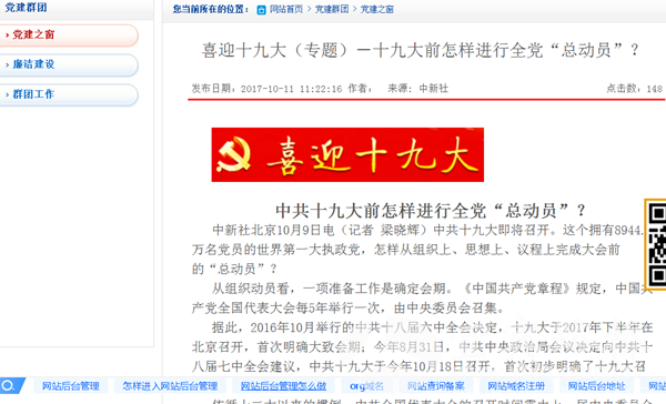 从10月10日起,宜宾路桥以公司网站为宣传平台,在党建群团窗口推出了“喜迎十九大”专题栏目,收集相关信息,编辑刊登党的十九大有关新闻点、知识点,转载新华社、人民日报、央视新闻、中国共产党新闻网等主流媒体所聚焦的十九大新闻专题系列报道,让广大职工通过该窗口及时了解这个举国关注的大事件。