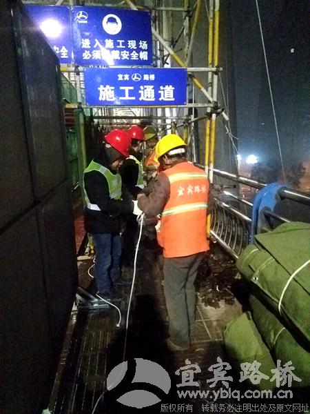 1月20日晚11点半,深夜的长江桥上寒气逼人,来往车辆渐稀,而在炽亮的路灯下,却来往不断地穿梭着宜宾路桥人忙碌的身影,他们是在趁着夜深车流量减少,在安全警戒线内装卸钢管,为明天施工现场搭建安全脚手架准备所需的材料……