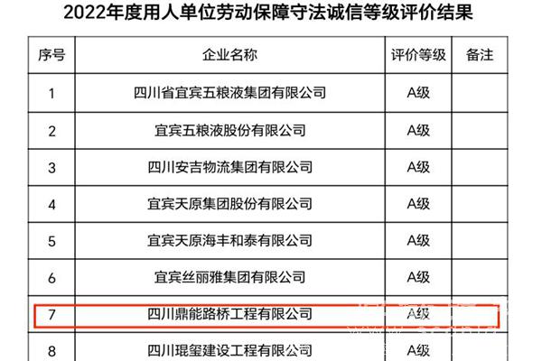近日,宜宾市人力资源和社会保障局根据《企业劳动保障守法诚信等级评价办法》(人社部规﹝2016﹞1号)开展企业劳动保障守法诚信等级评价工作,共评选出A级守信企业9家,路桥公司获此殊荣。