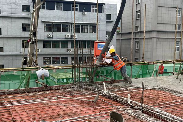 据悉,该二层楼,长约43.6米,宽20.8米,高4.5米,预计浇筑225方,主要连接三层底板及柱子。劳模精神从不是空头口号,而需身体力行。在施工过程中,由于水电班和木工班在面板上作业会部分影响钢筋班布筋,项目部管理人员便积极与各个班组进行沟通协调,避免出现因平行施工而影响施工进度的情况。项目部在傍晚施工时,会提前配备好夜间照明灯,坚定目标不动摇,不断优化浇筑方案与施工工序,充分发挥鼎能路桥“特别能吃苦、特别能战斗、特别能奉献”的三特精神,最终历经10个小时的艰苦奋斗,在傍晚十点前顺利完成二层柱及顶板混凝土浇筑。该次工序的顺利完成,极大鼓舞了项目部全体人员的信心,为完成既定目标任务打下了坚实的基础。
