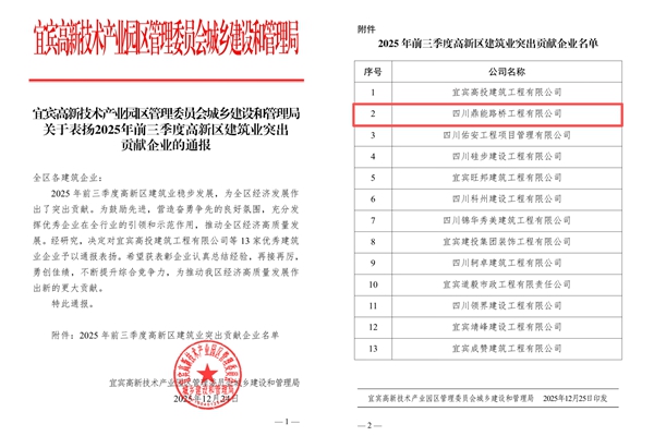 12月25日,宜宾高新技术产业园区管理委员会城乡建设和管理局印发通报,对2025年前三季度在园区建设工作中表现突出的企业予以表彰。鼎能路桥凭借在项目建设中的扎实履约与卓越贡献荣幸入选,荣获“2025年前三季度高新区建筑业突出贡献企业”称号。