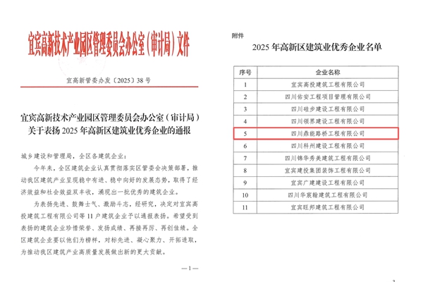 近日,宜宾高新技术产业园区管理委员会印发《关于表扬2025年高新区建筑业优秀企业的通报》,鼎能路桥成功入选前五。